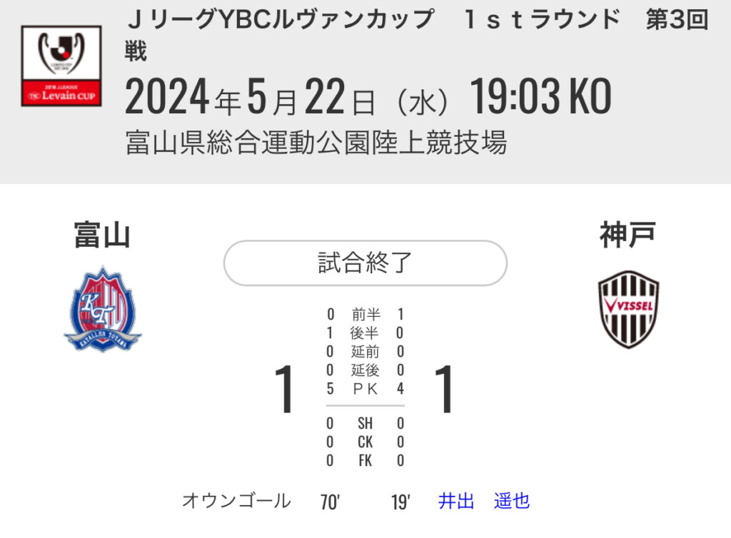 1: 久太郎 ★ 2024/05/22(水) 21:56:37.41 ID:s+W6tWvQ9 富山 1-1 神戸 PK戦 5-4 [得点者] 19'井出 遥也 (神戸) 70'オウンゴール(富山) スタジアム:富山県総合運動公園陸上競技場 入場者数:8,223人 https://www.jleague.jp/match/leaguecu... -