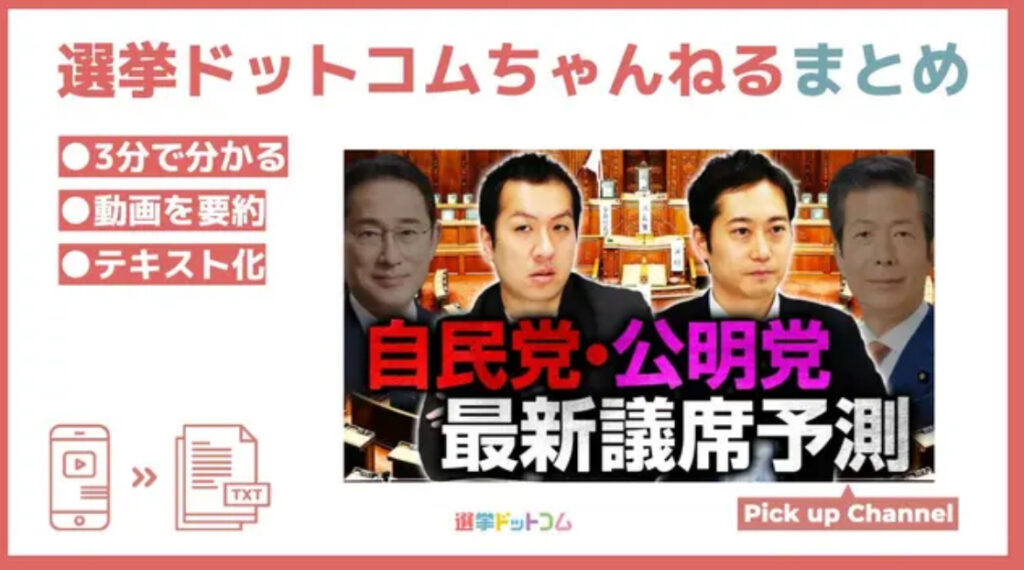 1: Ackerman ★ 2024/05/22(水) 13:54:50.61 ID:??? TID:NOcolor24 YouTube「選挙ドットコムちゃんねる」では、毎週選挙や政治に関連する情報を発信中です。 2024年5月17日に公開された動画のテーマは「6月解散で自公の議席数はどうなる?」 衆院補選が終わ... -