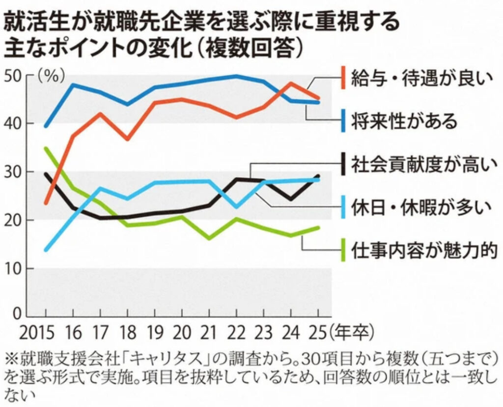 1: 影のたけし軍団 ★ 2024/05/22(水) 14:41:41.68 ID:??? TID:gundan 就活重視、給与が2年連続トップ 若者=やりがいは企業の幻想? 今の若者はやりがい重視――。それは企業から見た都合の良い思い込みなのかもしれない。 就職情報会社「キャリタス」が、2... -