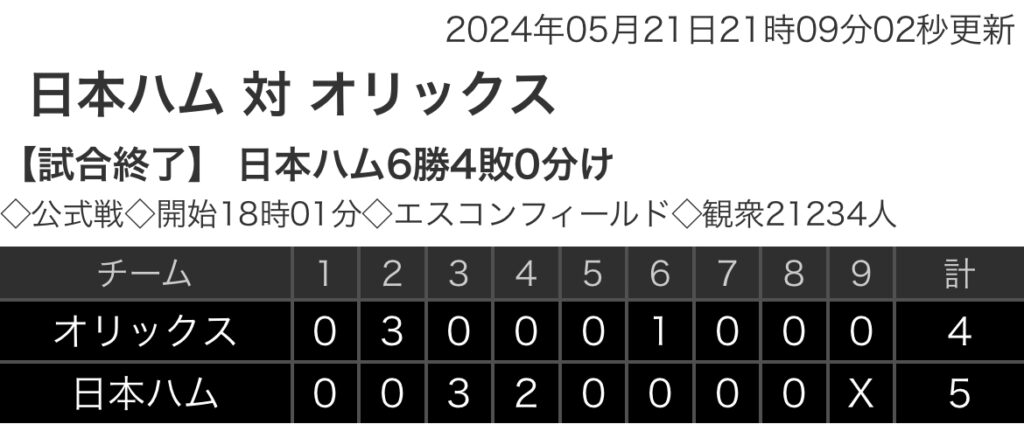 1: 鉄チーズ烏 ★ 2024/05/21(火) 20:57:46.30 ID:3/+t09MC9 オリックス. 0 3 0 0 0 1 0 0 0|4 日本ハム 0 0 3 2 0 0 0 0 x|5 【バッテリー】 (オ)エスピノーザ、古田島、富山、本田 - 森 (日)山﨑福也、鈴木... -