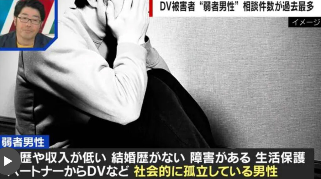1: @おっさん友の会 ★ 警備員[Lv.5][新芽] 2024/05/21(火) 14:10:13.41 ID:cZJg0gOs9 Abema的ニュースショー 2024/05/21 06:50 https://times.abema.tv/articles/-/10127266 パートナーからDV被害を受ける男性、通称「弱者男性」と呼ばれる人々がいる。一... -