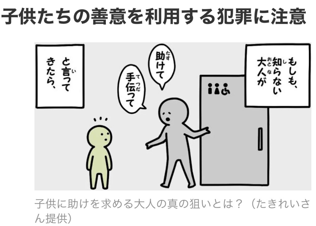 1: 朝一から閉店までφ ★ 2024/05/20(月) 22:03:22.18 ID:??? TID:syoubainin 2024.05.20 ひとりでいる子供に、トイレの前で知らない大人が声を掛けてきます。その人は困った様子ですが……? 子供が犯罪に巻き込まれないための対応策を描いたマンガが話題で... -