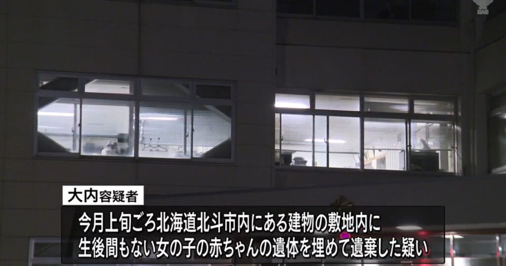 1: nita ★ 2024/05/20(月) 17:54:23.01 ID:B3JtSVTs9 5/20(月) 10:45配信 青森放送 北海道北斗市にある建物の敷地内に生後まもない女の子の赤ちゃんの遺体を埋めて遺棄したとして弘前市の女が逮捕されました。 逮捕されたのは自称弘前市若党町の接客業、大... -
