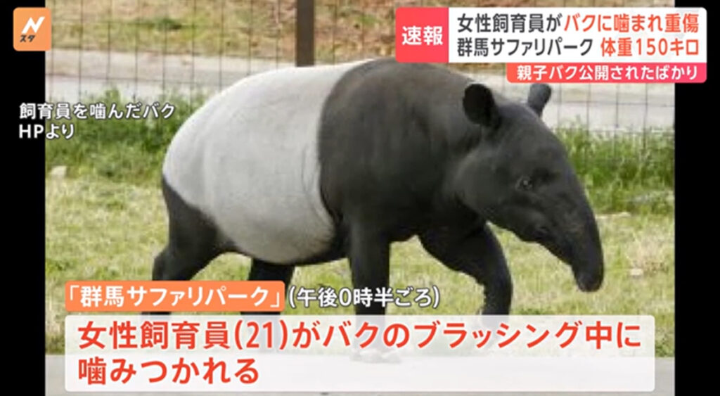 1: nita ★ 2024/05/20(月) 19:06:32.29 ID:B3JtSVTs9 5/20(月) 18:25配信 TBS NEWS DIG Powered by JNN きょう昼すぎ、群馬県富岡市にある「群馬サファリパーク」で女性飼育員(21)が、飼育しているメスのバクに噛まれ重傷を負いました。 群馬サファリパ... -