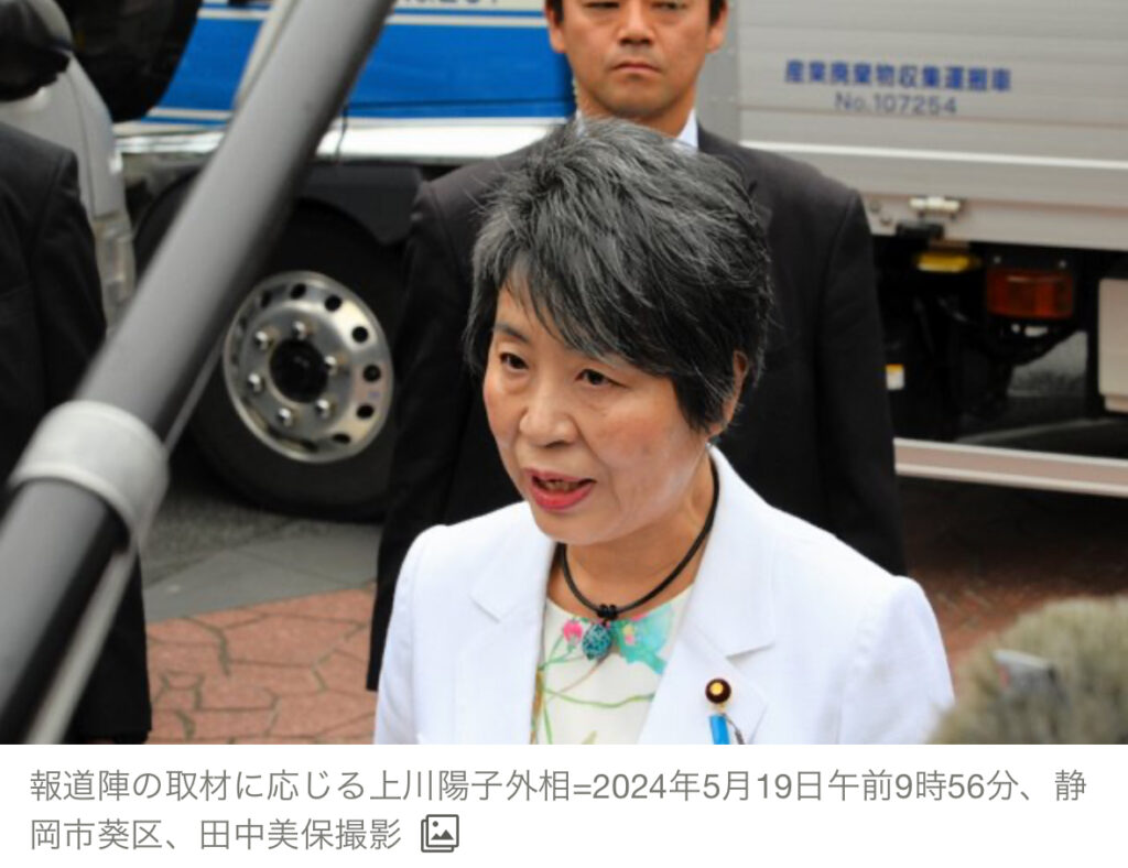 1: 蚤の市 ★ 2024/05/19(日) 10:47:47.54 ID:OF4pXQJb9 静岡県知事選の応援演説で女性に対する配慮を欠いたとも受けとめられかねない発言をした上川陽子外相は19日午前、静岡市内で報道陣の取材に応じ、「女性パワーで未来を変えるというわたしの真意と... -