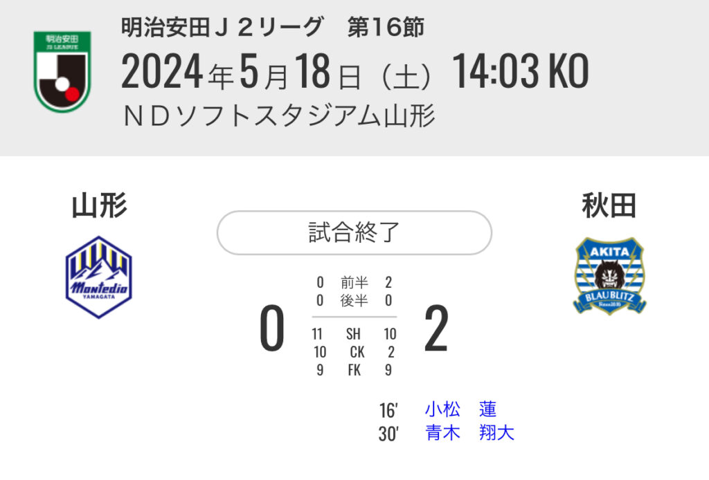 1: 久太郎 ★ 2024/05/18(土) 16:57:28.65 ID:N8bbMi5V9 山形 0-2 秋田 [得点者] 16'小松 蓮 (秋田) 30'青木 翔大(秋田) スタジアム:NDソフトスタジアム山形 入場者数:8,229人 https://www.jleague.jp/match/j2/2024/051803/live#live/ 水...