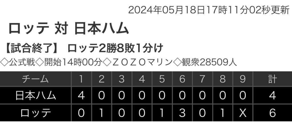 1: 鉄チーズ烏 ★ 2024/05/18(土) 17:10:42.94 ID:sZaNiWVw9 日本ハム 4 0 0 0 0 0 0 0 0|4 ロッテ. 0 1 0 0 1 3 0 1 x|6 【バッテリー】 (日)加藤貴、ロドリゲス、矢澤、齋藤友 - 田宮 (ロ)メルセデス、国吉... -