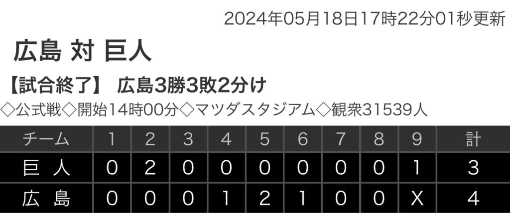 1: 鉄チーズ烏 ★ 2024/05/18(土) 17:18:06.31 ID:sZaNiWVw9 巨人 0 2 0 0 0 0 0 0 1 |3 広島 0 0 0 1 2 1 0 0 x |4 【バッテリー】 (巨)赤星、大江、ケラー、泉 - 岸田、小林 (広)九里、森浦、矢崎、島内、栗林 -... -