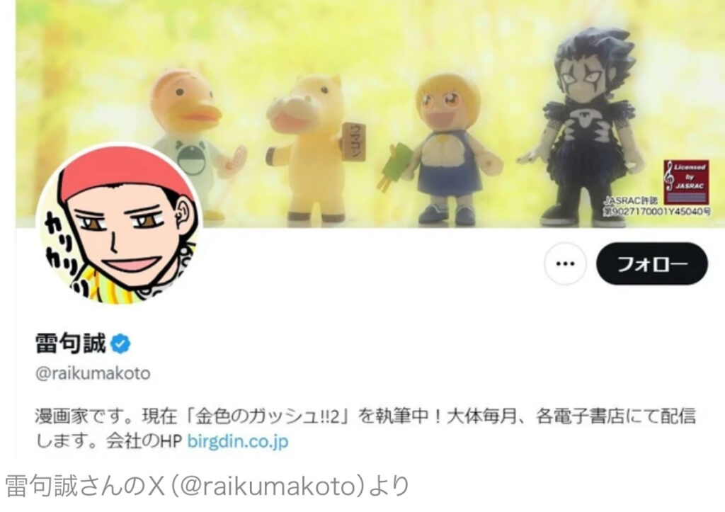1: 朝一から閉店までφ ★ 2024/05/16(木) 17:02:46.49 ID:9KrmOAiu9 2024.05.16(Thu) よろず~ニュース編集部 「金色のガッシュ!!」「どうぶつの国」などで知られる漫画家・雷句誠さんが16日、自身のx(旧ツイッター)を更新し、 漫画家によるSNSで... -