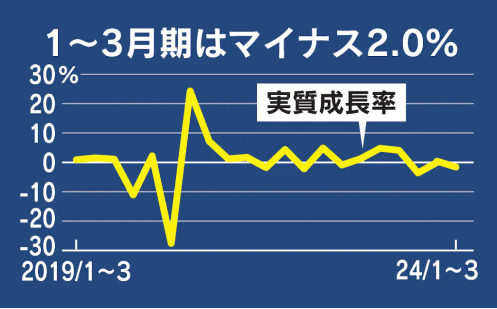 1: 蚤の市 ★ 2024/05/16(木) 08:58:56.00 ID:wwfIC0hH9 内閣府が16日発表した1-3月期の国内総生産(GDP)速報値は物価変動の影響を除いた実質の季節調整値が前期比0.5%減、年率換算で2.0%減だった。2四半期ぶりのマイナス成長となった。 QUICKが事前にまと...