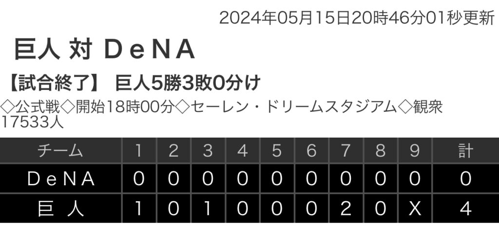 1: 鉄チーズ烏 ★ 2024/05/15(水) 20:43:57.93 ID:gu5KzAav9 DeNA 0 0 0 0 0 0 0 0 0 |0 巨人 1 0 1 0 0 0 2 0 x |4 【バッテリー】 (De)石田健、三嶋、坂本 - 戸柱 (巨) 堀田、西舘、高梨.、泉 - 岸田 ... -