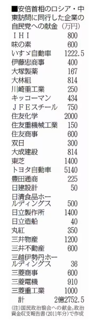1: 名無しさん@涙目です。(茸) [CZ] 2024/05/14(火) 20:59:55.79 ID:ou1zd8kd0● BE:487816701-PLT(13060) sssp://img.5ch.net/ico/samekimusume32.gif 首相トップセールス同行企業 自民に献金2億3000万円 https://www.jcp.or.jp/akahata/aik13/2013-... -
