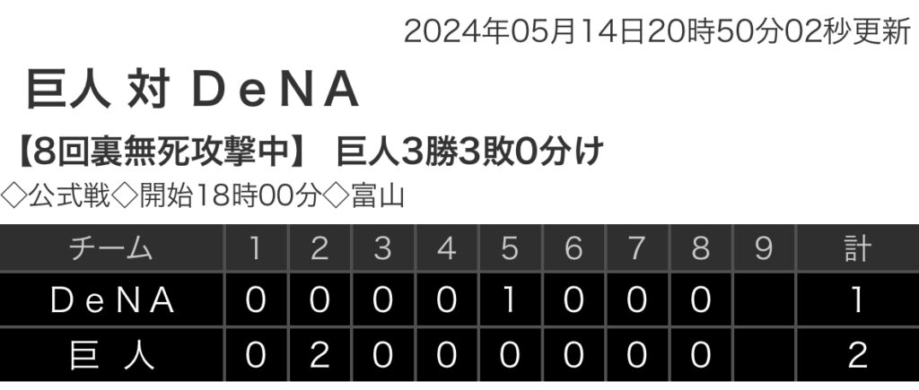 【野球】セ・リーグ G 2-1 DB [5/14] 巨人・山﨑伊織7回1失点、岸田1号2ランホームラン DeNA連敗