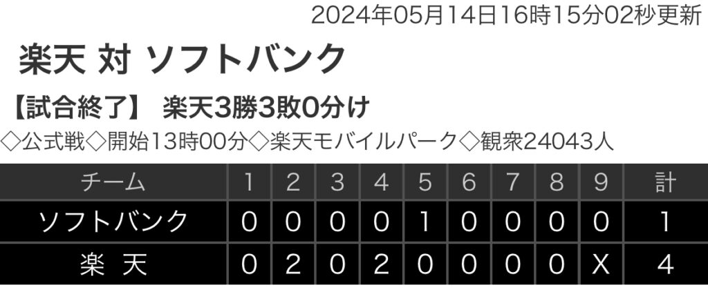 1: 鉄チーズ烏 ★ 2024/05/14(火) 18:11:05.96 ID:wW4heKHD9 ソフトバンク 0 0 0 0 1 0 0 0 0|1 楽天. 0 2 0 2 0 0 0 0 x|4 【バッテリー】 (ソ)有原、長谷川、又吉、津森 - 甲斐 (楽)ポンセ、酒居、宋家... -