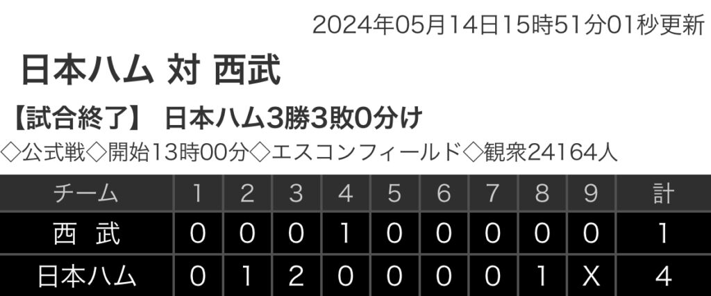 1: 鉄チーズ烏 ★ 2024/05/14(火) 18:05:39.56 ID:wW4heKHD9 西武. 0 0 0 1 0 0 0 0 0|1 日本ハム 0 1 2 0 0 0 0 1 x|4 【バッテリー】 (西)高橋光成、増田、羽田 - 古賀 (日)山﨑福也 - 伏見 【本塁打】 ...