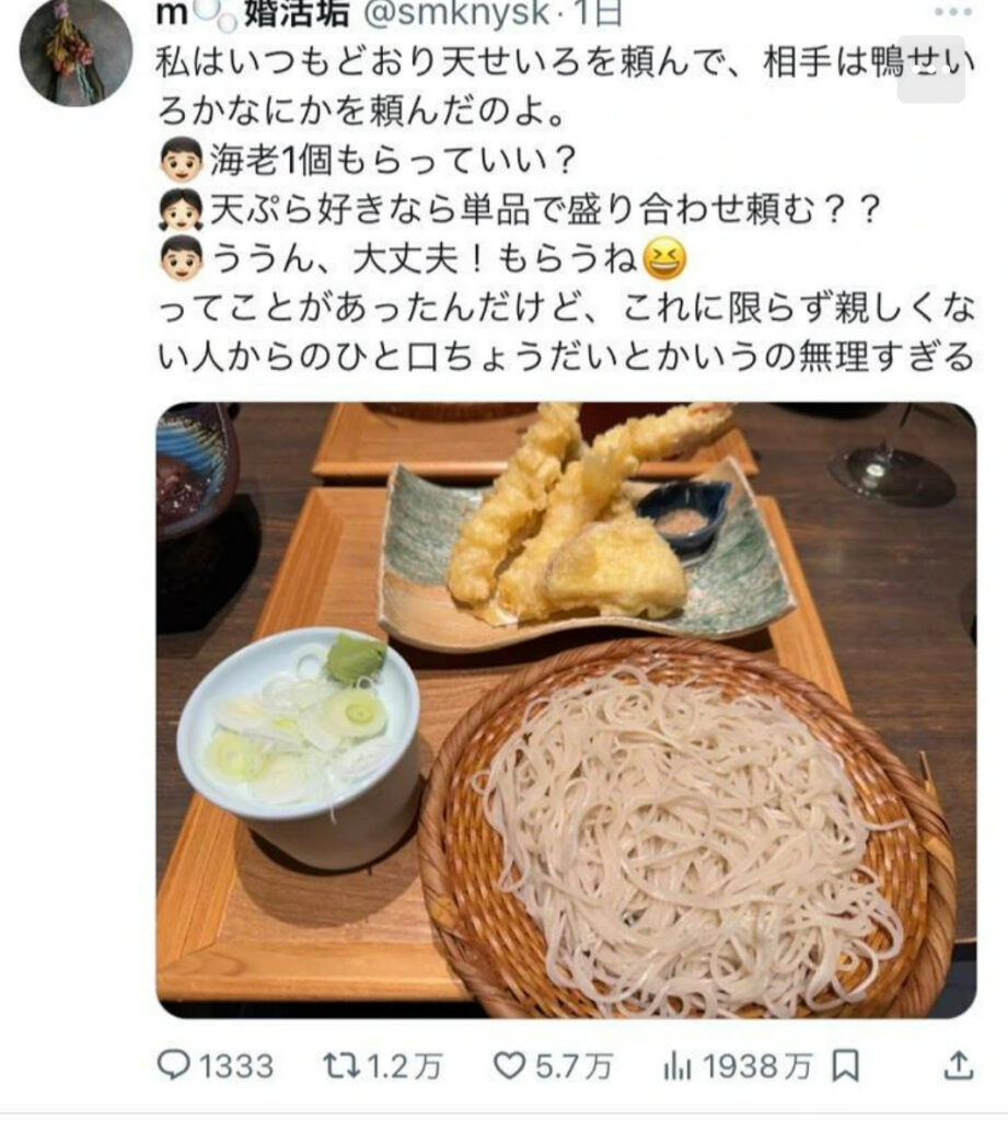 婚活女子「天せいろを頼んだら相手にエビ天1本食われた。ギャオオオン!」