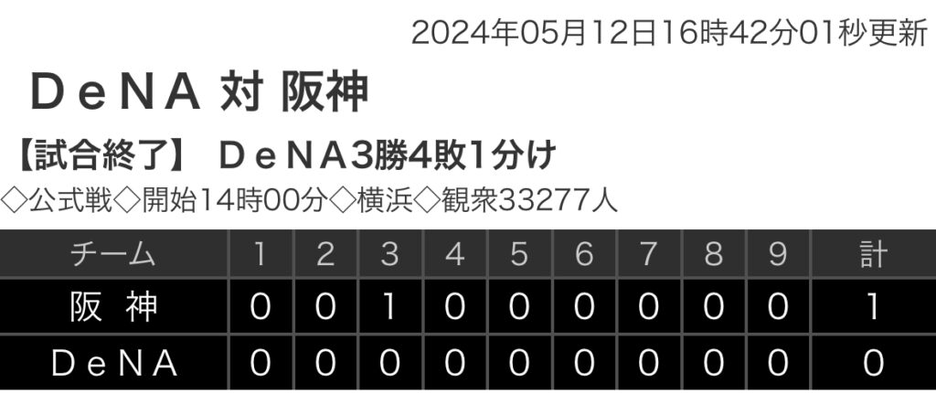 1: 鉄チーズ烏 ★ 2024/05/12(日) 16:35:32.30 ID:IwI9RsOA9 阪神 0 0 1 0 0 0 0 0 0 |1 DeNA 0 0 0 0 0 0 0 0 0 |0 【バッテリー】 (阪) 才木 - 梅野 (De)大貫、伊勢 - 山本 【本塁打】 (阪) (De) ...