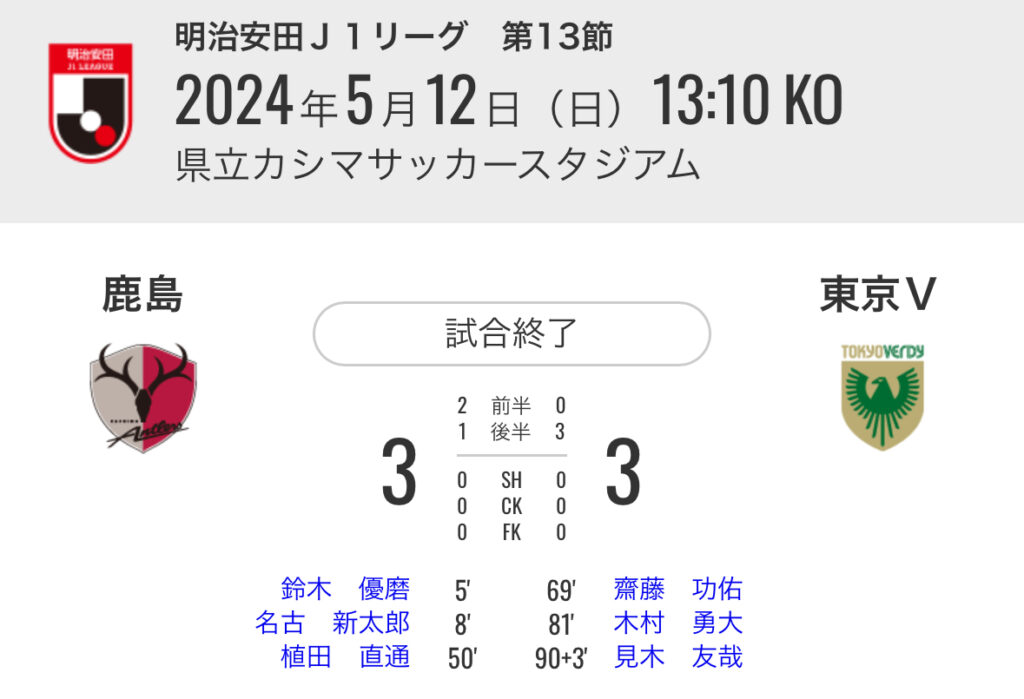 1: 久太郎 ★ 2024/05/12(日) 15:05:34.73 ID:zH8Xkfva9 鹿島 3-3 東京V [得点者] 05'鈴木 優磨 (鹿島)PK 08'名古 新太郎(鹿島) 50'植田 直通 (鹿島) 69'齋藤 功佑 (東京V) 81'木村 勇大 (東京V) 90+3'見木 友哉(東京V) スタジ... -