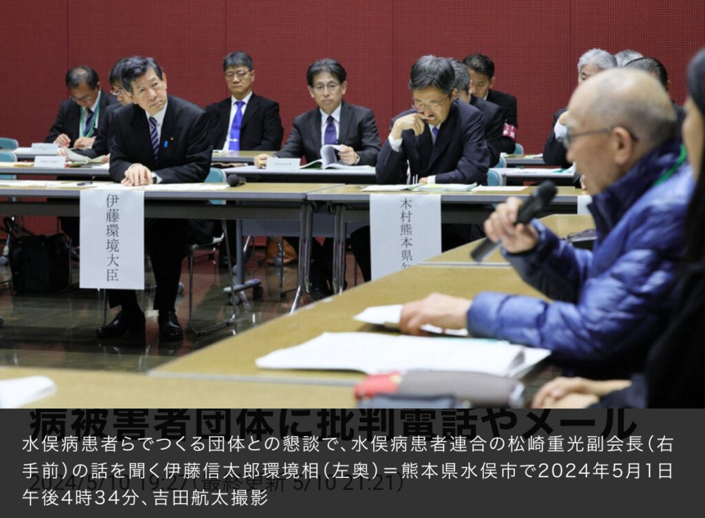 1: 蚤の市 ★ 2024/05/11(土) 07:25:21.99 ID:aNqB/47Z9 水俣病患者・被害者らと伊藤信太郎環境相との懇談時に環境省職員が被害者らの発言を制止した問題を巡り、被害者団体側に「3分間の持ち時間を守らないのがおかしい」などと批判する電話やメールが9... -