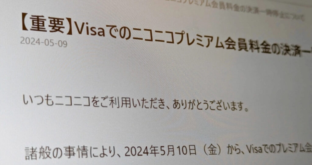 1: デビルゾア ★ 2024/05/09(木) 23:10:03.17 ID:aySo33Zo9 ドワンゴは5月9日、同社の動画サービス「ニコニコ」の有料会員「プレミアム会員」において、Visaでの料金支払いを10日から一時停止すると発表した。同社は2023年11月にMastercard、24年3月にAmer... -