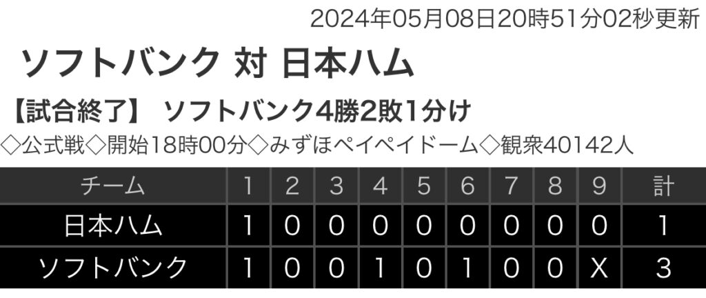 1: 鉄チーズ烏 ★ 2024/05/08(水) 21:04:39.34 ID:VsbgcVWM9 日本ハム 1 0 0 0 0 0 0 0 0|1 ソフトバンク . 1 0 0 1 0 1 0 0 x|3 【バッテリー】 (日)金村、ロドリゲス、堀、生田目、マーフィー - 田宮 (ソ)石川... -
