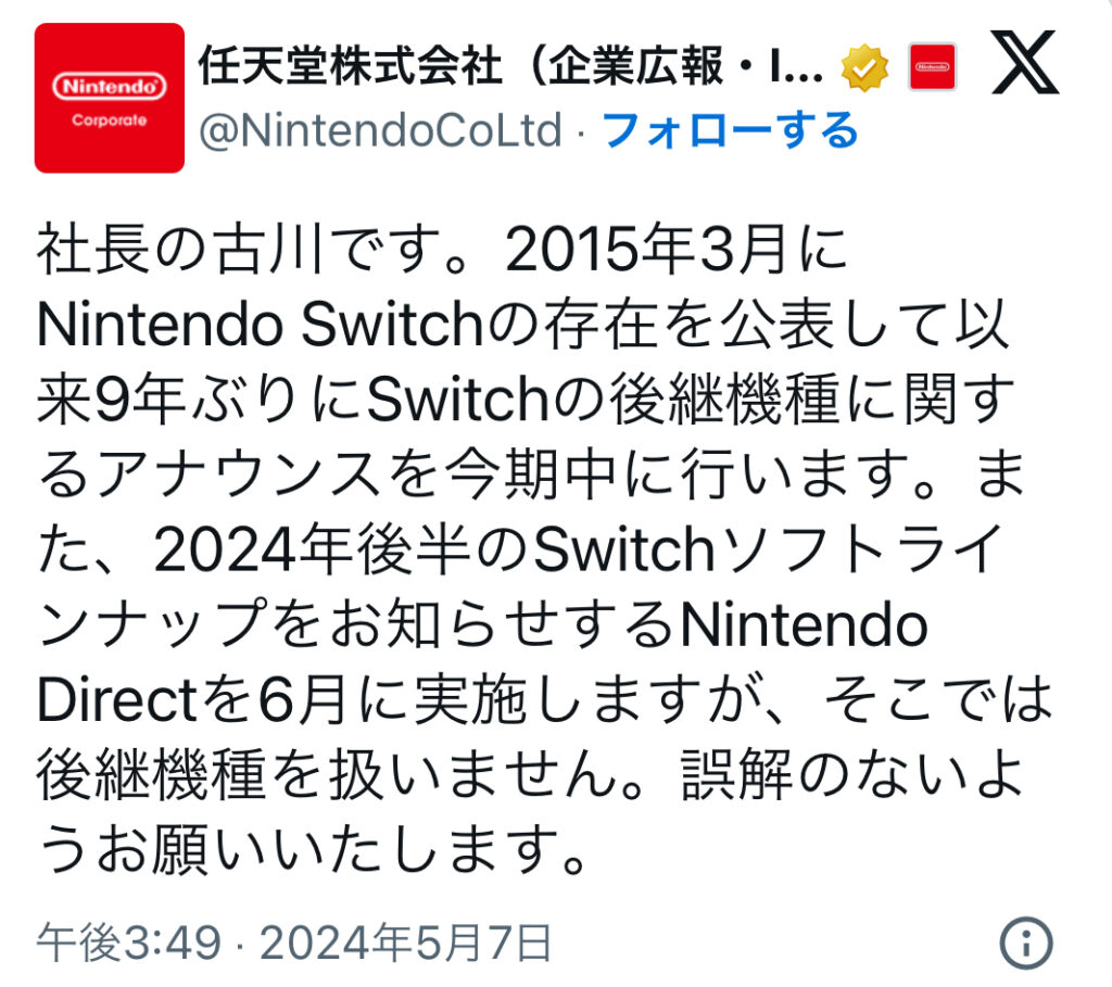 1: 朝一から閉店までφ ★ 2024/05/07(火) 16:20:48.37 ID:fTuJ3wfJ9 2024.05.07 16:10 任天堂は、同社の公式Xアカウントにて、「Switchの後継機種に関するアナウンスを今期中に行います」と発表した。 Nintendo Switchは、2015年3月に存在を公表、その後201... -
