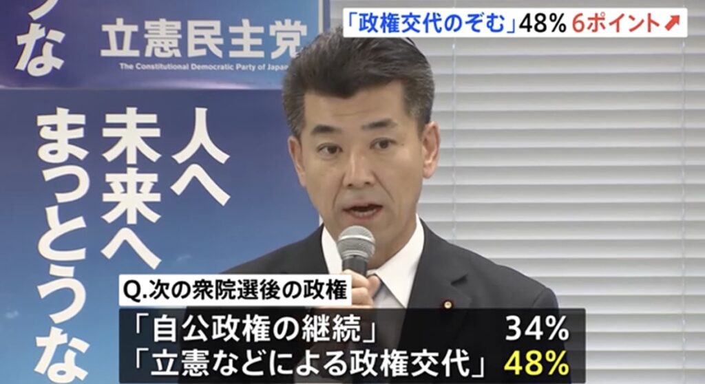 1: Hitzeschleier ★ 2024/05/06(月) 20:11:50.69 ID:Yp+6JygO9 次の衆院議員選挙で「政権交代」をのぞむ人が「自公政権の継続」を上回ったことがJNNの世論調査で分かりました。 来年10月に衆議院が任期満了を迎えるなか、次の衆院選で「自民・公明による政... -