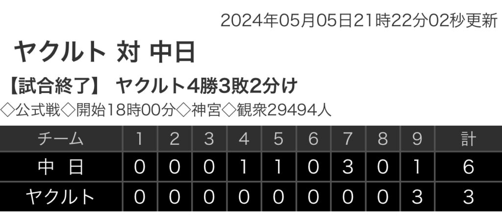 1: 鉄チーズ烏 ★ 2024/05/05(日) 21:10:58.88 ID:jZJok5+f9 中日 0 0 0 1 1 0 3 0 1 |6 ヤクルト 0 0 0 0 0 0 0 0 3 |3 【バッテリー】 (中)高橋宏、マルティネス - 宇佐見 (ヤ)小澤、山本、大西、柴田 - 松本直... -
