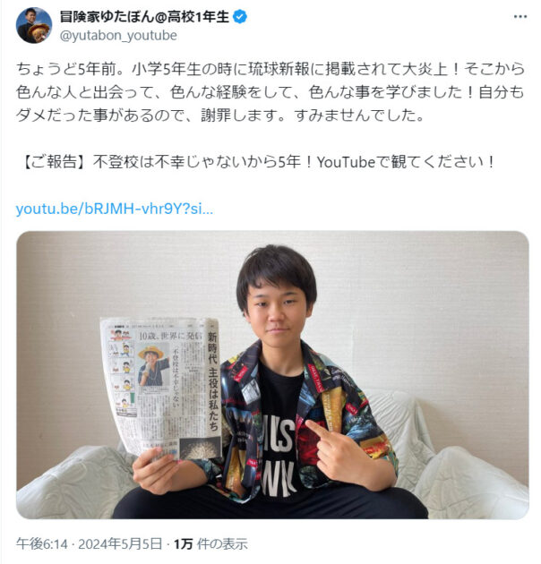 【YouTuber】ゆたぼん「少年革命家」誕生から5年経過を報告 10歳→15歳「自分もダメだった事がある。すみませんでした」