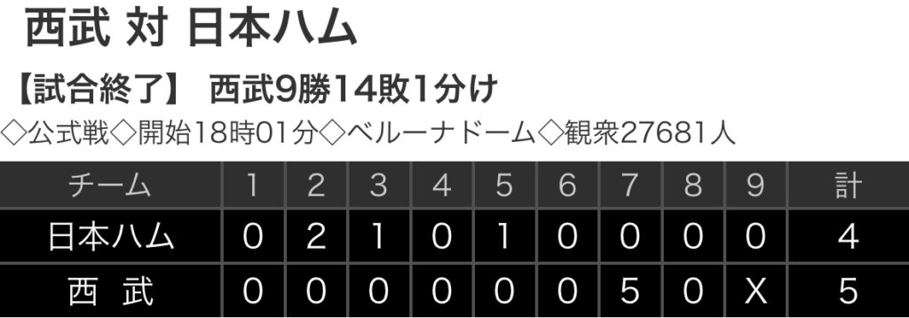 1: 鉄チーズ烏 ★ 2025/09/25(木) 21:05:29.15 ID:9PaxFBsx9 日本ハム 0 2 1 0 1 0 0 0 0|4 西武. 0 0 0 0 0 0 5 0 x|5 【バッテリー】 (日)北山、上原、田中 - 田宮 (西)今井、浜屋、山田、E.ラミレス、平良 ... -