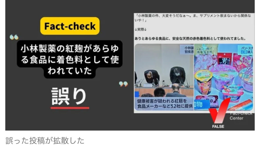 1: 夜のけいちゃん ★ 2024/03/30(土) 08:00:56.79 ID:MfpLrTW+9 3/30(土) 7:54配信 日本ファクトチェックセンターぐり、「小林製薬の紅麹があらゆる食品に赤色着色料として使われている」という言説が拡散していますが、誤りです。着色料は食品添加物のベ... -