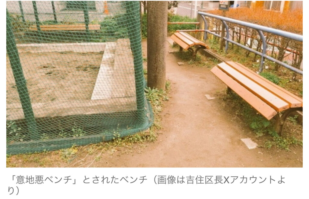 1: ギャラガー ★ 2024/03/29(金) 19:14:06.25 ID:??? TID:gallagher 記事では、アーチ状にデザインされた公園のベンチの写真とともに、「新種の意地悪ベンチ」だとするXの投稿を紹介。ベンチが「ホームレス対策」「排除デザイン」「悪意ある所業」とのコメ... -