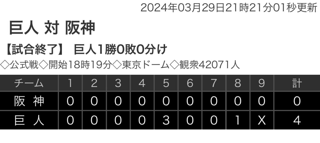 1: 鉄チーズ烏 ★ 2024/03/29(金) 21:10:13.03 ID:cis+tWfx9 阪神 0 0 0 0 0 0 0 0 0 |0 巨人 0 0 0 0 3 0 0 1 x |4 【バッテリー】 (阪)青柳、島本、漆原、加治屋 - 坂本 (巨)戸郷、西舘、中川、大勢 - 大城卓 【本... -