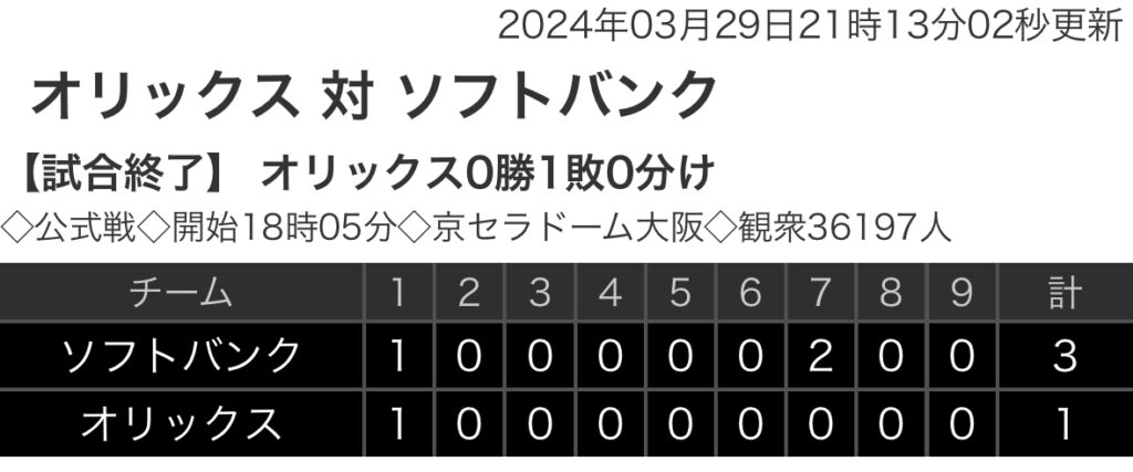 1: 鉄チーズ烏 ★ 2024/03/29(金) 21:04:47.67 ID:cis+tWfx9 ソフトバンク. 1 0 0 0 0 0 2 0 0|3 オリックス 1 0 0 0 0 0 0 0 0|1 【バッテリー】 (ソ)有原、松本裕、藤井、オスナ - 甲斐 (オ)宮城、吉田、山﨑... -