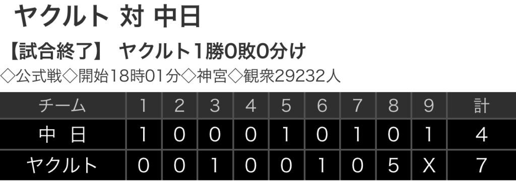 1: 鉄チーズ烏 ★ 2024/03/29(金) 21:44:56.66 ID:cis+tWfx9 中日 1 0 0 0 1 0 1 0 1 |4 ヤクルト 0 0 1 0 0 1 0 5 x |7 【バッテリー】 (中)柳、勝野、清水、松山、梅野 - 木下 (ヤ)サイスニード、星、嘉弥真... -