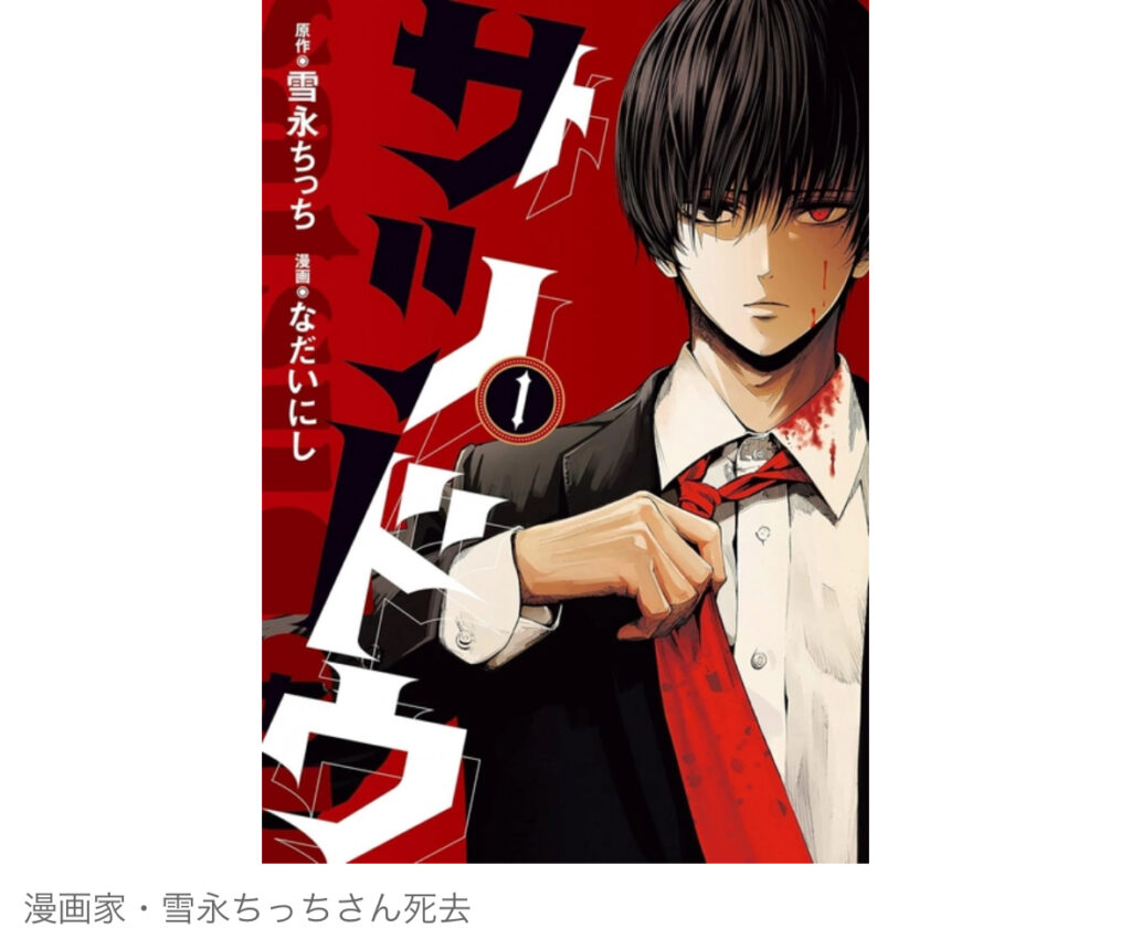1: ばぐっち ★ 2024/03/25(月) 05:08:07.11 ID:??? TID:BUGTA 漫画『サツドウ』(原作)で知られる漫画家・雪永ちっちさんが亡くなった。『ヤングマガジン』(講談社)公式サイトで25日に発表された。 サイトでは「『ヤングマガジン』で連載中の『サツド... -