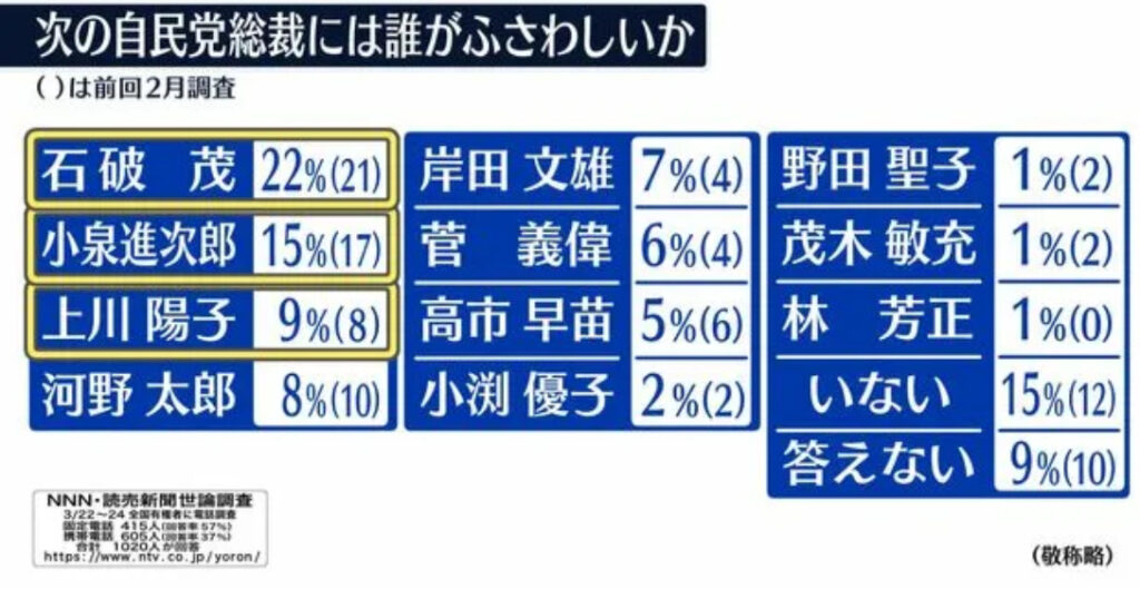 1: 少考さん ★ 2024/03/24(日) 22:06:46.82 ID:gaWaGyN09 ※調査期間:3月22日から24日 「ポスト岸田」上川外相3位浮上 菅氏も復活?【NNN・読売新聞 世論調査】 (日テレNEWS NNN) - Yahoo!ニュース https://news.yahoo.co.jp/articles/bf0227f94669ead...