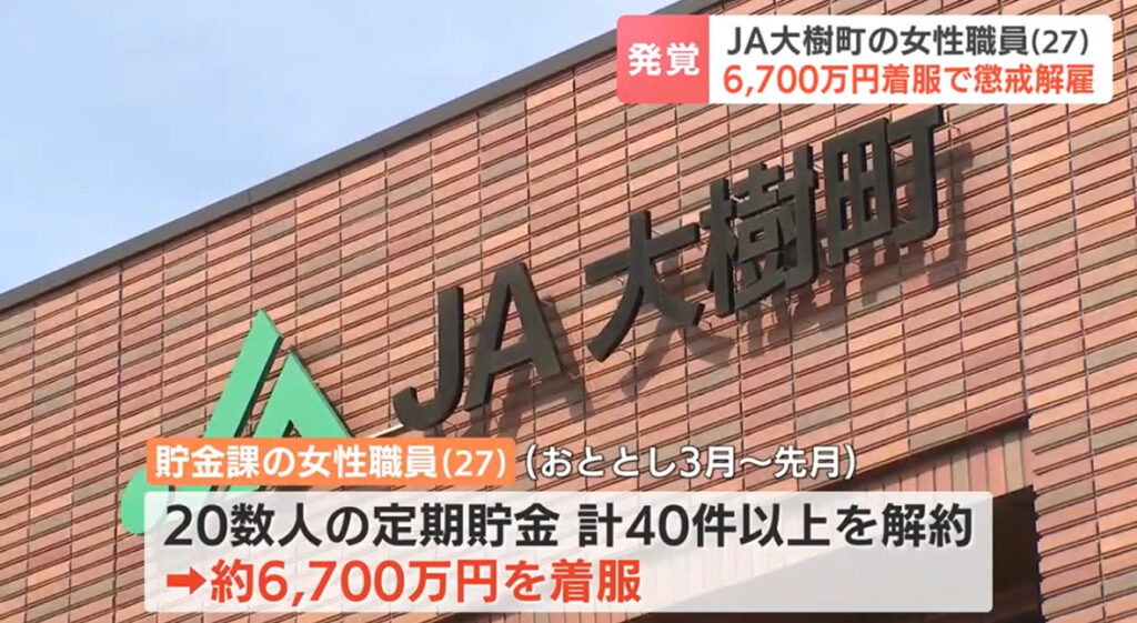 1: KOU ★ 2024/03/20(水) 22:32:28.17 ID:??? TID:kougou 北海道十勝地方のJA大樹町の27歳の女性職員が、顧客の定期貯金を勝手に解約し、およそ6700万円を着服したとして、懲戒解雇されたことがわかりました。JA大樹町 西川久雄組合長 「この度は、大... -
