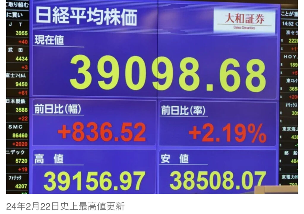 1: ギャラガー ★ 2024/03/20(水) 11:20:46.91 ID:??? TID:gallagher 東京株式市場で2月22日、日経平均株価は3万9098円(終値)をつけ、約34年ぶりに史上最高値を更新した。3月4日には4万109円で取引を終え、史上初の4万円の大台に乗った。値動きはあるが、...