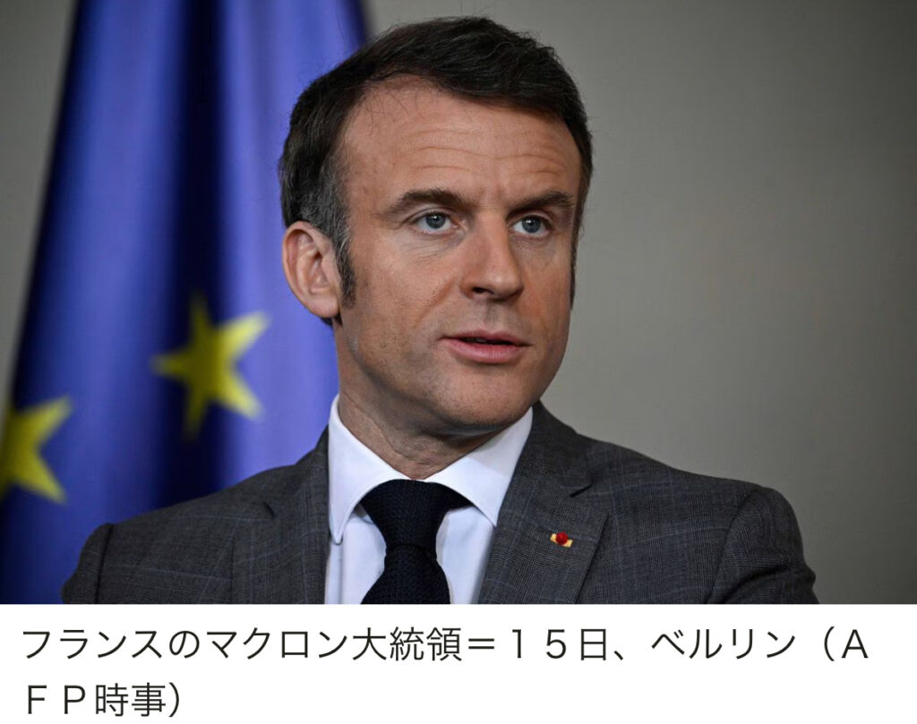 1: 蚤の市 ★ 2024/03/17(日) 20:22:40.25 ID:BYRf6WA69 【パリAFP時事】フランスのマクロン大統領は15日、ロシアの侵攻を受けるウクライナを支援するため、どこかの時点で欧米諸国が派兵する必要があるとの認識を改めて示した。16日付の地元紙パ... -