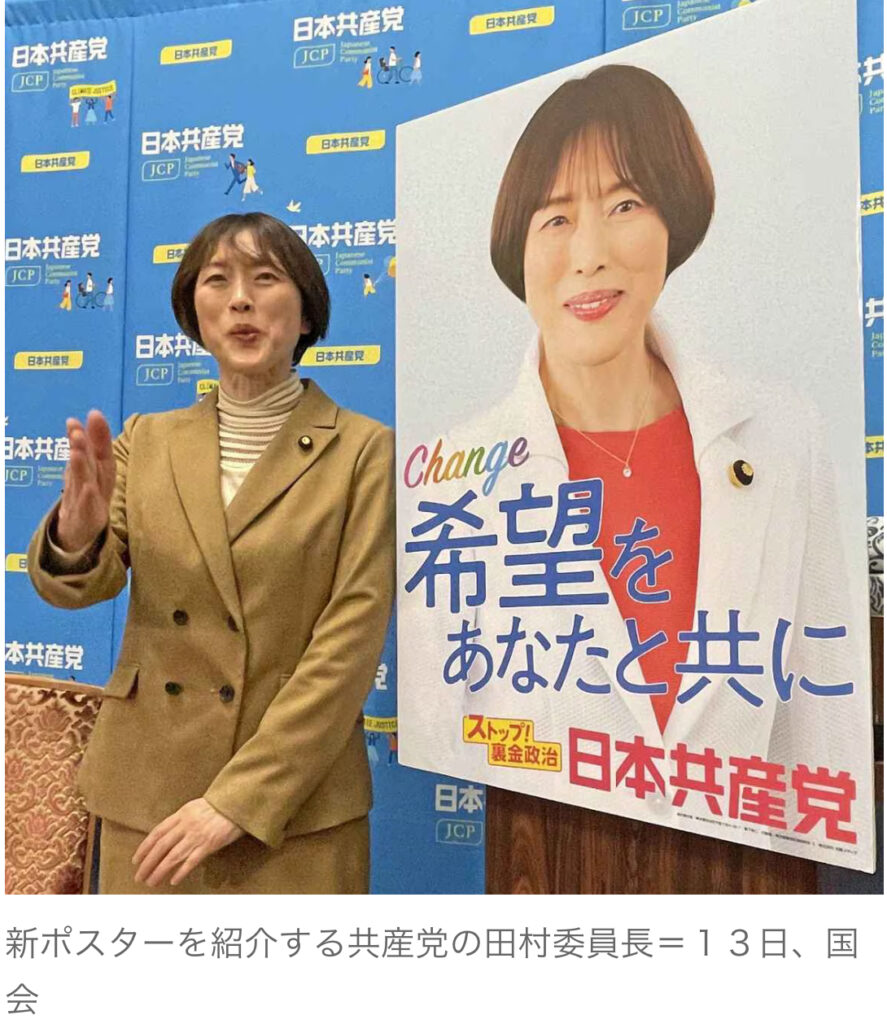 1: 少考さん ★ 2024/03/14(木) 00:21:37.51 ID:pdpgdUR79 共産党が衆院選へ新ポスター 「希望をあなたと共に」 - 産経ニュース https://www.sankei.com/article/20240313-LYX4V4DOIJIVLPKZCSJKSNXFWM/ 2024/3/13 23:13 新ポスターを紹介する共産党の田村... -