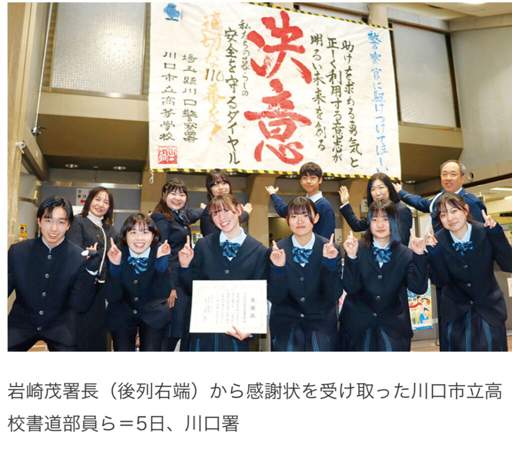 【埼玉】埼玉で一番忙しい川口警察署、110番の適正利用訴えた川口市立高書道部に感謝状