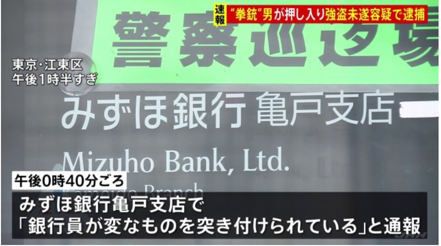 1: 茶瓶 ★ 2024/03/12(火) 15:51:10.89 ID:??? TID:OCHA きょう正午すぎ、東京・江東区にあるみずほ銀行の支店に拳銃のようなものを持った男が押し入り、金を奪おうとして現行犯逮捕されました。 午後0時40分ごろ、江東区亀戸のみずほ銀行亀戸支店で、「銀... -