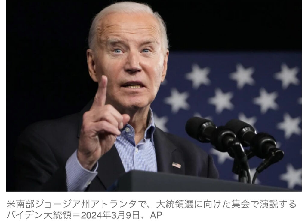1: 名無しさん@涙目です。(庭) [JP] 2024/03/10(日) 12:20:14.70 ID:xtBrx4Aq0● BE:448218991-PLT(14145) sssp://img.5ch.net/ico/aroeri-na32.gif バイデン米大統領(民主党)は9日、一般教書演説(7日)で南部ジョージア州の女子大学生殺害事件に言及し... -