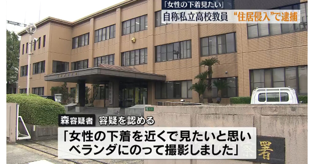1: レノン ★ 2024/03/10(日) 12:00:25.60 ID:??? TID:lennon 10日未明、アパートのベランダに無断で侵入したとして私立高校の教員の男が現行犯逮捕されました。 「干された女性の下着を近くで見たいと思った。」と話しているということです。 住居侵入の疑... -