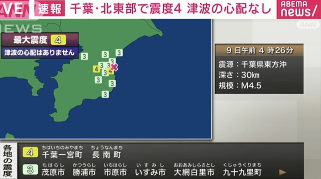 1: もん様(みかか) [ニダ] 2024/03/09(土) 04:40:10.06 ID:MniPRLzy0● BE:421685208-2BP(4000) sssp://img.5ch.net/ico/syobo2.gif 午前4時26分ごろに千葉県北東部で震度4の地震がありました。 震源地は千葉県東方沖で、地震の規模(マグニチュード)は4.... -
