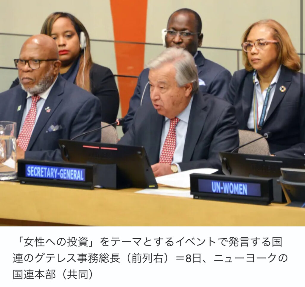 1: 蚤の市 ★ 2024/03/09(土) 08:43:24.25 ID:o9dQLdaM9 【ニューヨーク共同】国際女性デーの8日、米ニューヨークの国連本部で「女性への投資」をテーマとするイベントが開かれた。国連のグテレス事務総長は「世界中で何百万人の女性が固定観念と戦ってい... -