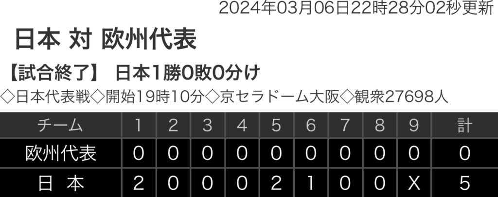 【野球】日本 5-0 欧州 [3/6] 日本代表完封リレー 山下舜平大159km/k 村上先制打、近藤2安打2打点、青山学院大西川2安打