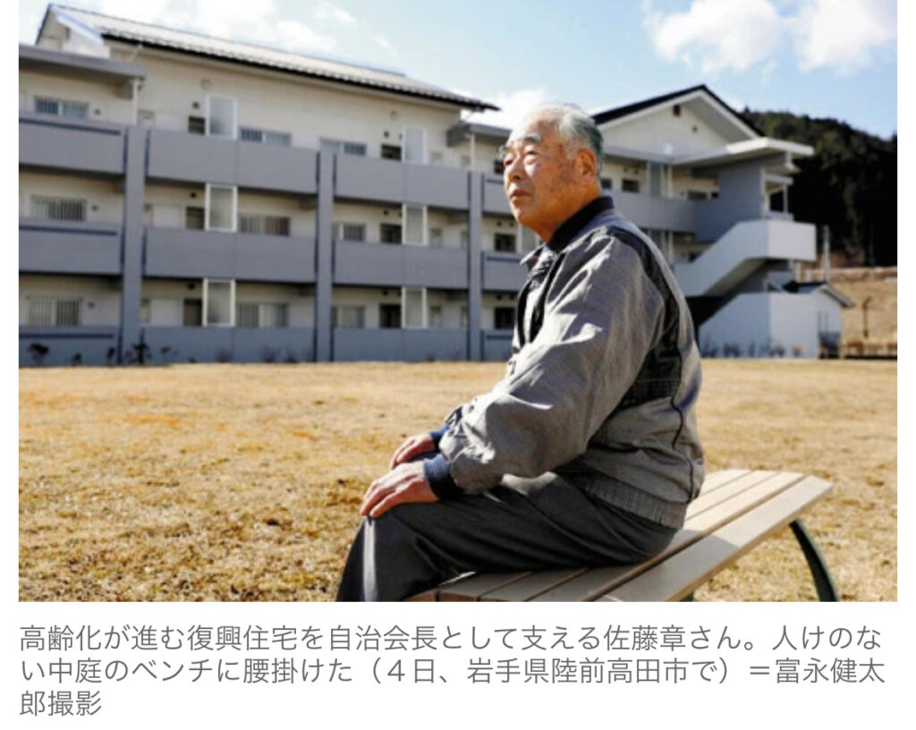 1: ◆Gap/News.k おっさん友の会 ★ 2024/03/05(火) 14:08:34.93 ID:G3fHbhDk9 東日本大震災の発生から、まもなく13年になる。岩手、宮城、福島3県に約3万戸整備された災害公営住宅(復興住宅)で、入居者の高齢化率(65歳以上の割合)がコミュニティ...