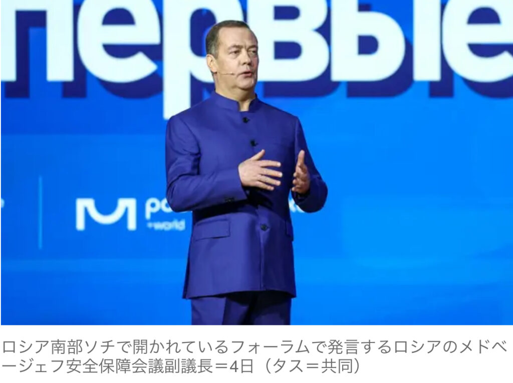 1: 首都圏の虎 ★ 2024/03/05(火) 07:09:10.29 ID:dLkF1wMZ9 ロシアのメドベージェフ安全保障会議副議長(前大統領)は4日、「ウクライナは言うまでもなくロシアだ」と述べ、ゼレンスキー政権を無条件降伏させるまで侵攻作戦を続けると述べた。ロシア通信... -